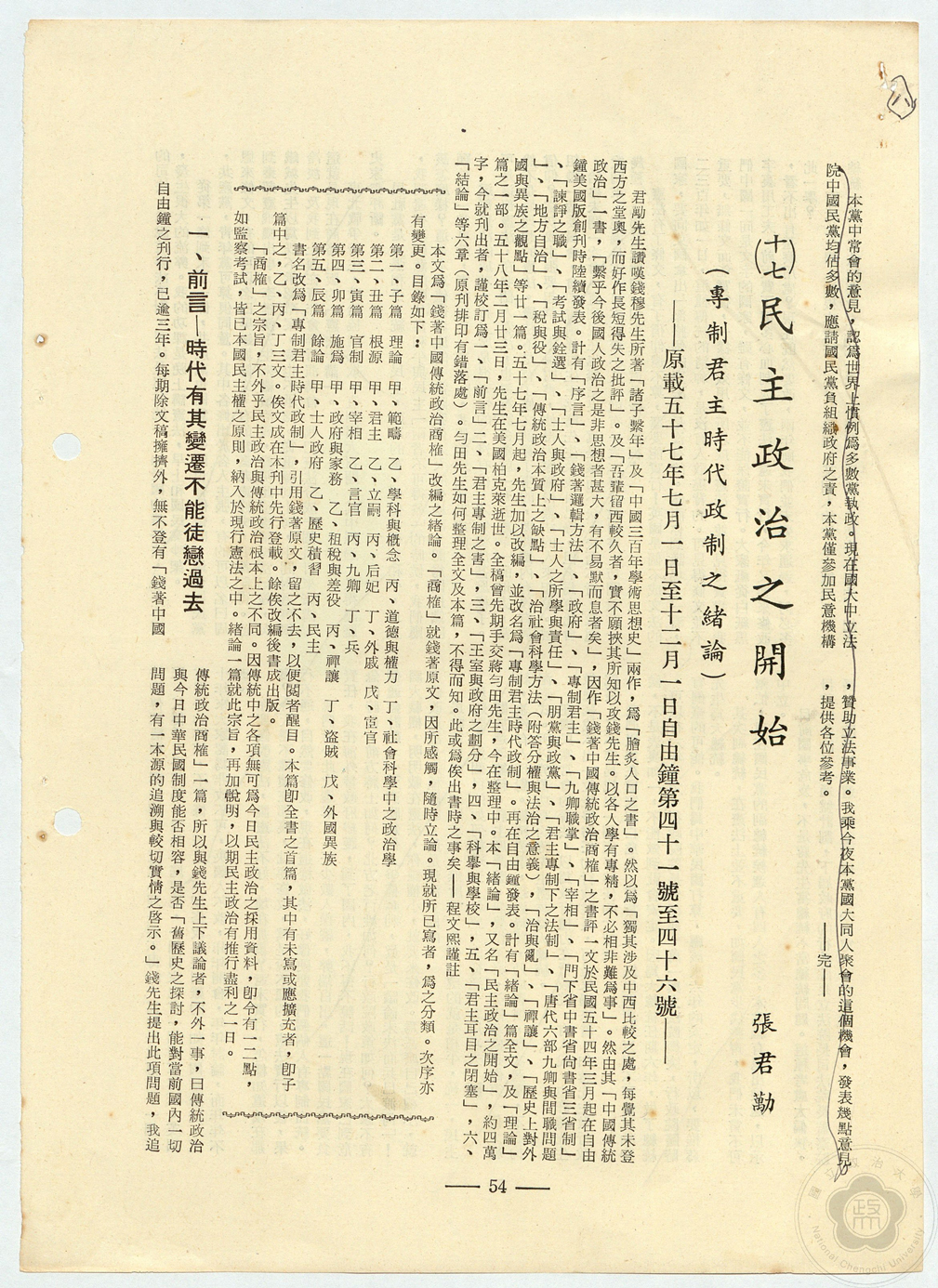 然而,憲政理想在內戰與政局變動中屢遭挫折。1949年後,張君勱選擇旅居海外,對威權政治深感失望,試圖凝聚海外第三勢力以延續憲政理念,但終未成局。晚年,他轉向哲學與文化研究,成為當代新儒家思想的重要代表之一。