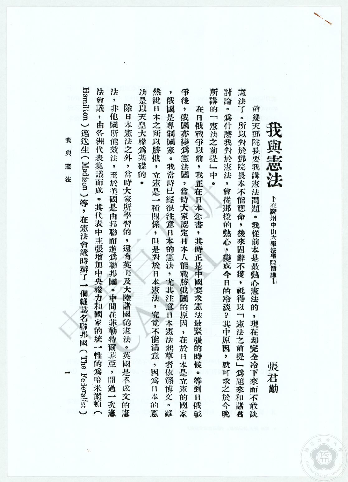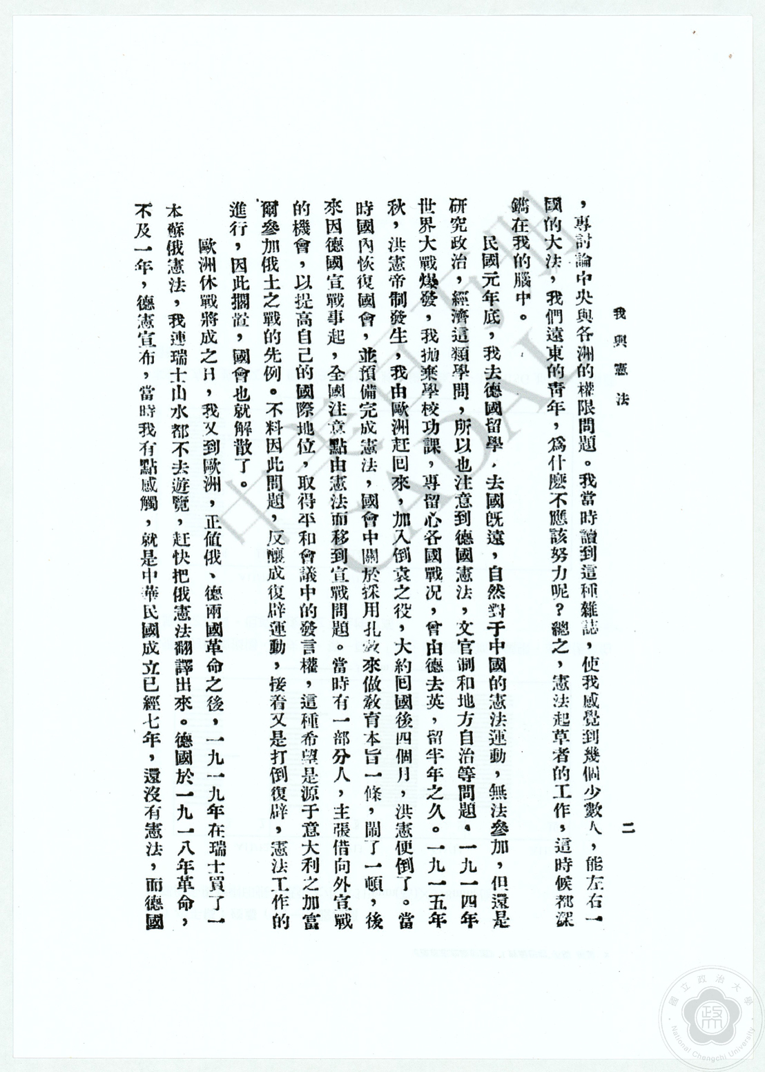 張君勱既是學者,也是行動者。他以憲政理想為終身志業,積極參與政黨與政治改革。1932年,在國共對立的局勢下,他創立中國國家社會黨,主張以民主憲政結合社會公平,探索不同於兩黨的「第三條道路」。抗日戰爭期間,他投入憲政準備工作,1941年擔任中國民主政團同盟(後改為中國民主同盟)常務委員,持續倡議以憲政取代訓政,推動政治民主化。