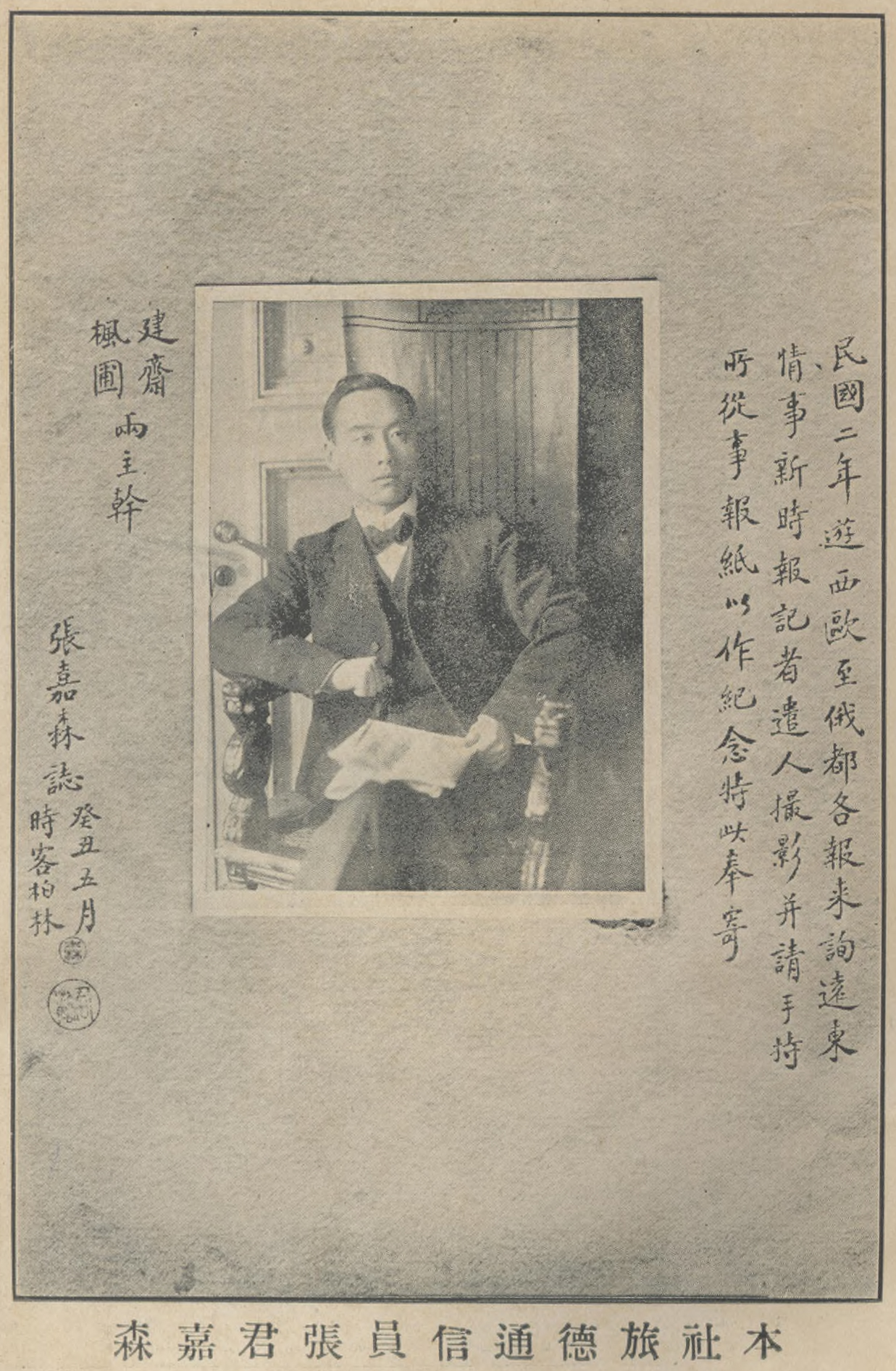 圖說:憲法新聞社旅德通信員張嘉森旅居柏林時期照片。影像來源:《憲法新聞》1913年1-24期附圖。