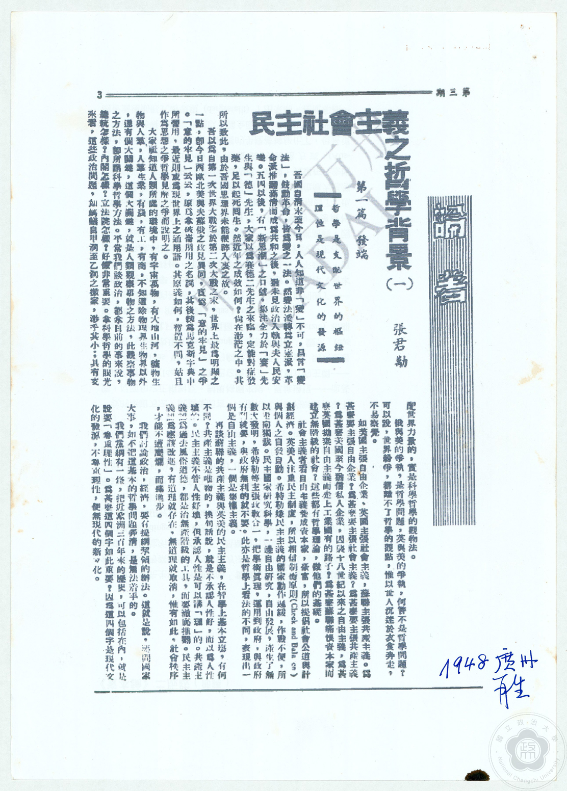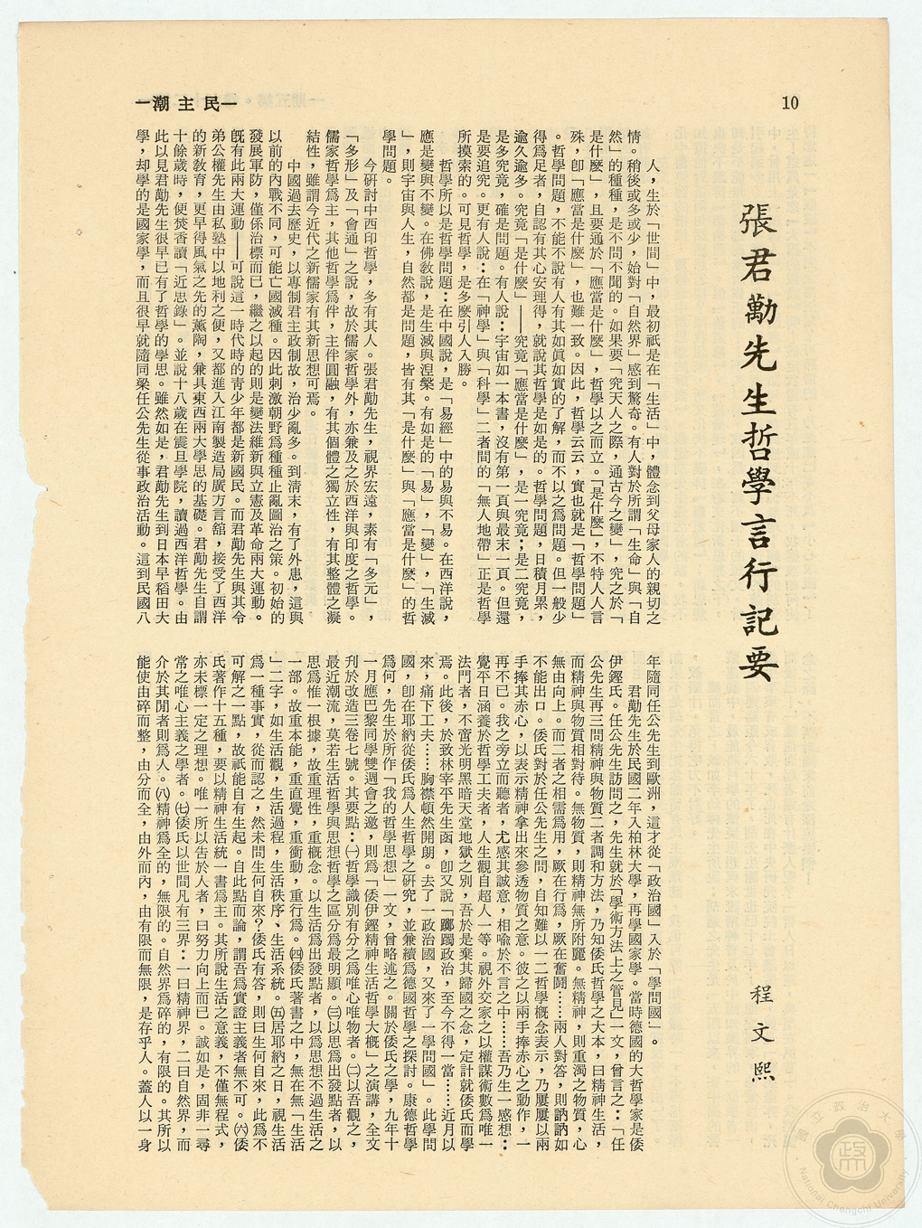 1921年底,張君勱學成歸國,陪同倭鏗弟子杜里舒(Hans Driesch)來華講學,旋即於1923年的「科玄論戰」中登上思想舞台。從法學訓練到哲學沉思,張君勱完成了從政治現實到精神重建的轉化,並奠定了以憲政、道德與社會正義為核心的思想體系。