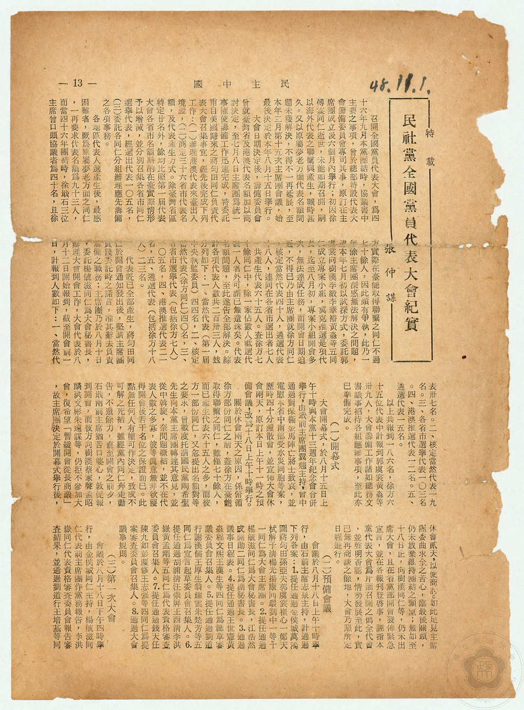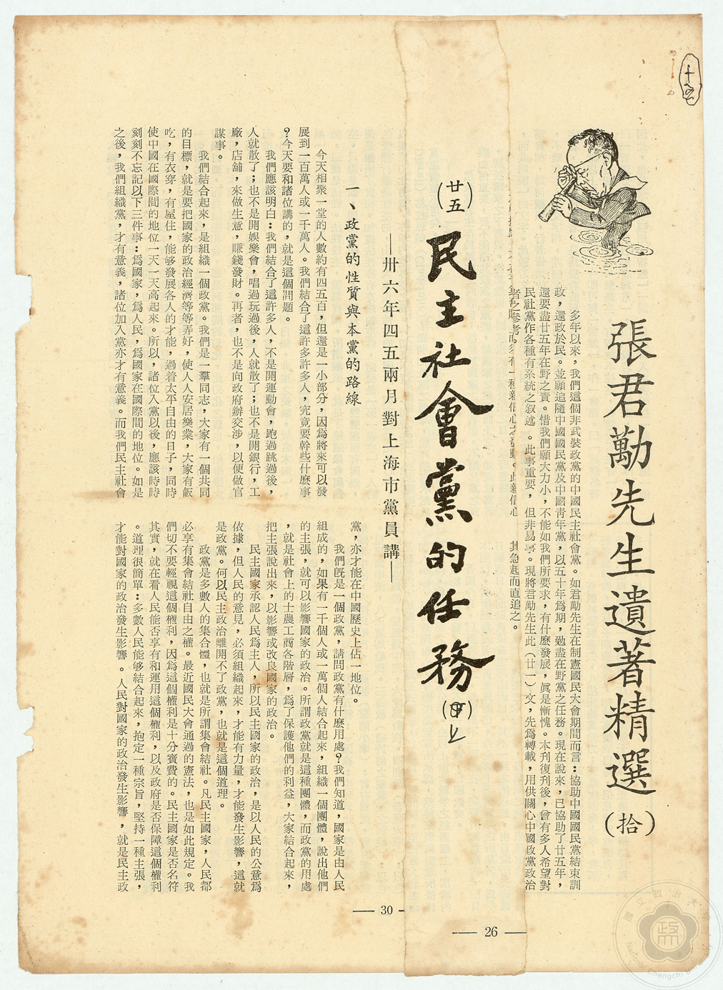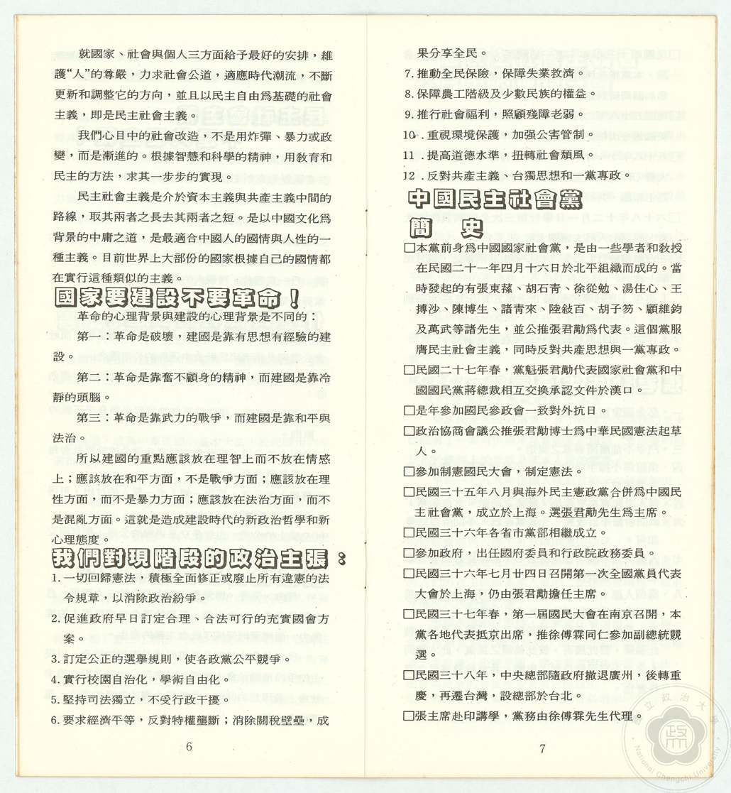 1946年8月,中國國家社會黨與民主憲政黨合併,成立中國民主社會黨。該黨主張以憲政推動民主,因支持參加制憲國大而與堅決抵制的中國民主同盟決裂,最終退出民盟。