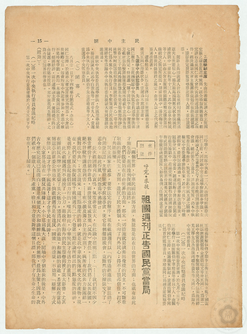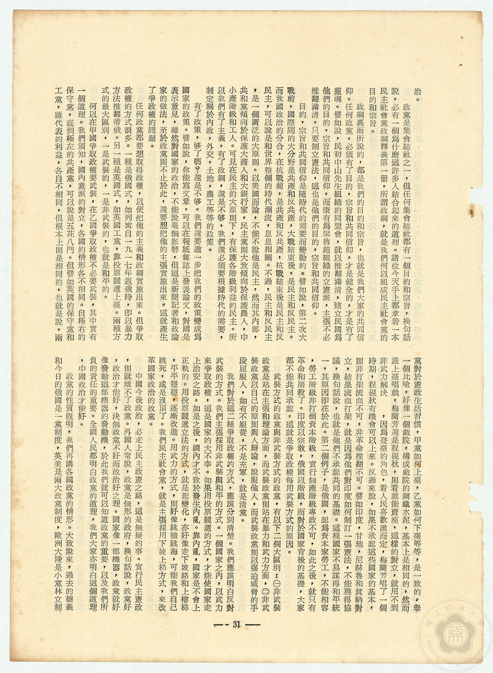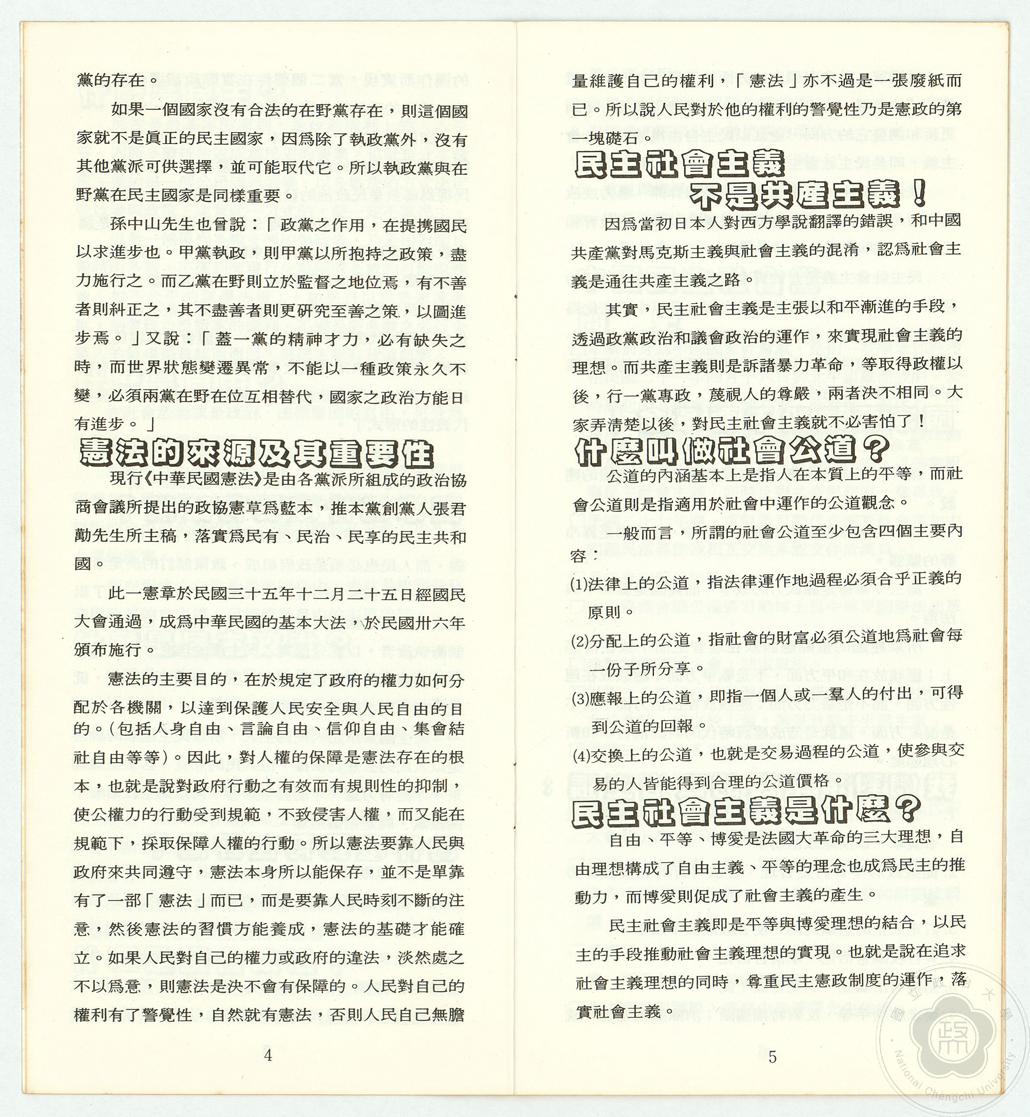 1946年8月,中國國家社會黨與民主憲政黨合併,成立中國民主社會黨。該黨主張以憲政推動民主,因支持參加制憲國大而與堅決抵制的中國民主同盟決裂,最終退出民盟。
