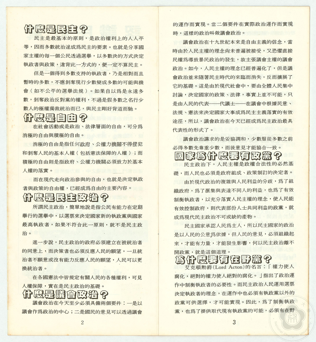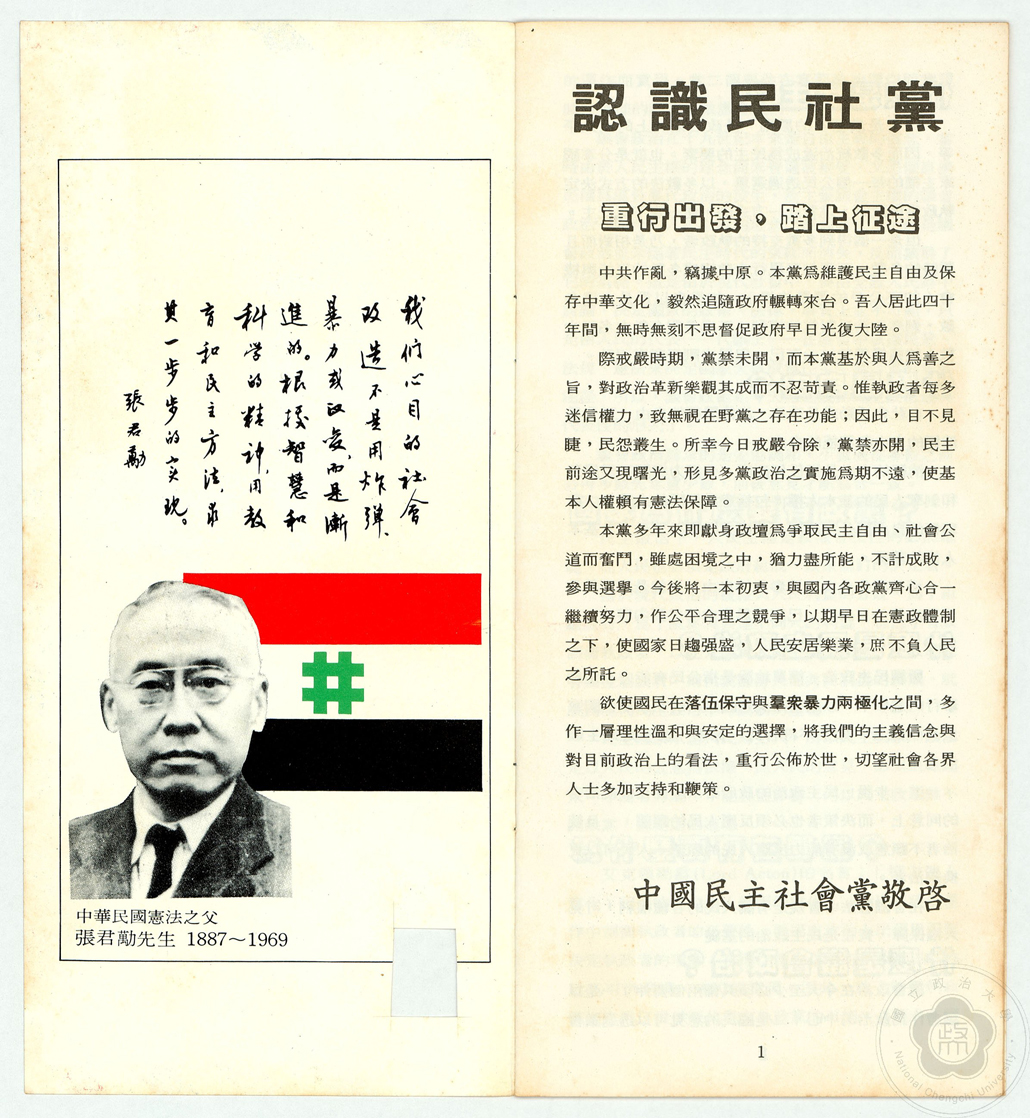民社黨的「大紅、純白、鐵黑」三色黨旗象徵熱情、公道與紀律;綠色「井字」黨徽取意井田制度,象徵和平與社會平等。這些符號體現了張君勱對「社會正義與自由憲政並行」的信念。